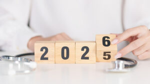 2025 end year to Happy New Year 2026 with Stethoscope of doctor and heart shape on table. health care, Insurance, Wellness and medical concepts